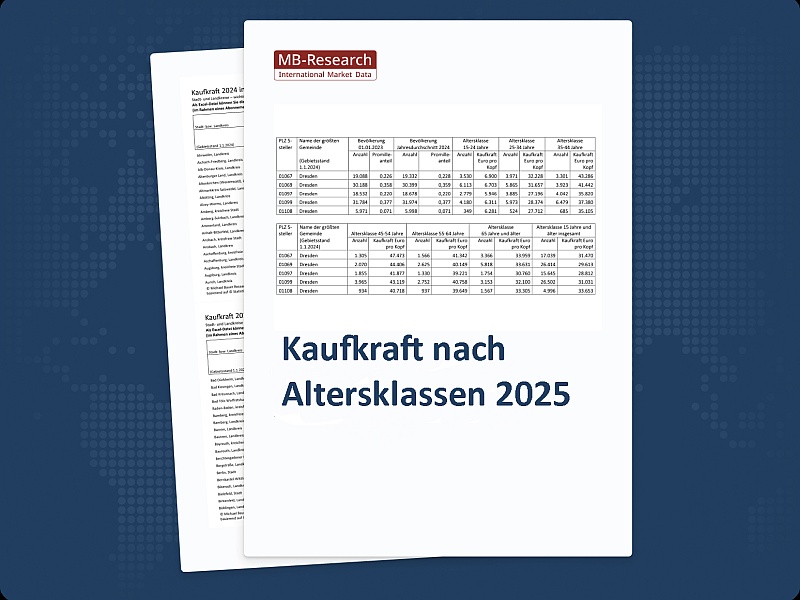Die Kaufkraft nach Altersklassen ist relevant für konsumorientierte Detail-Analysen. Sie differenziert die Kaufkraft nach sechs Altersklassen: 15-24 J. / 25-34 J. / 35-44 J. / 45-54 J. / 55-64 J. / 65 Jahre und älter.